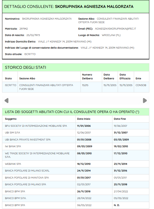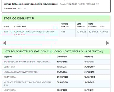 Consulente Finanziario abilitato all'Offerta Fuori Sede, iscritto all'Albo Unico dei Consulenti Finanziari con delibera CONSOB nr. 15215 del 15/11/2005